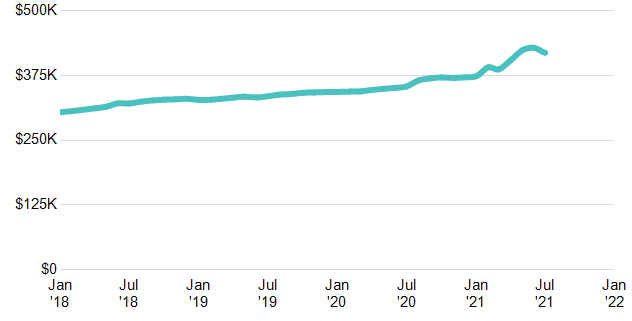 Median Estimated Home Value:$418,690 —– Updated: 07/31/2021 —– Change over last month: -2.31% —– Change over last 12 months:+18.33%