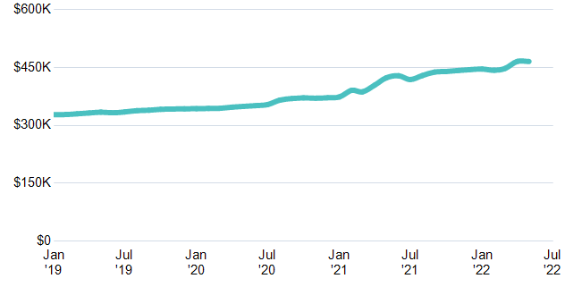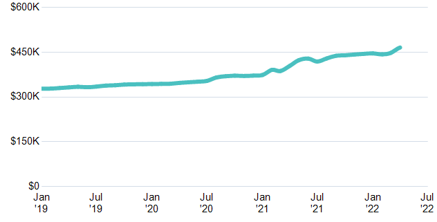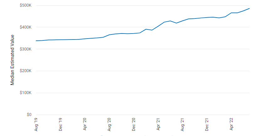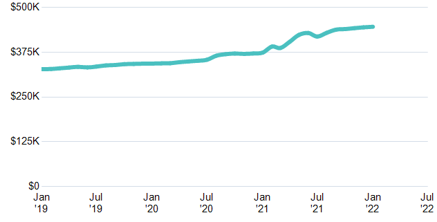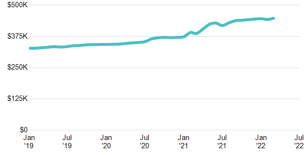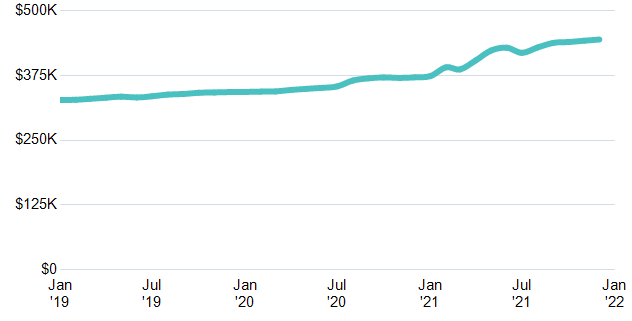 Median Estimated Home Value:$428,610 —– Updated: 06/30/2021 —– Change over last month: 1.28% —– Change over last 12 months:+22.08%