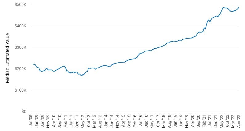 Median Estimated Home Value:$429,050 —– Updated: 08/31/2021 —– Change over last month: 2.47% —– Change over last 12 months:+17.45%